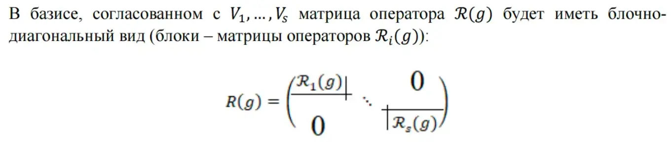 Говорят, что представление разлагается в прямую сумму линейных преобразований: если разлагается в прямую сумму инвариантных подпространств и .