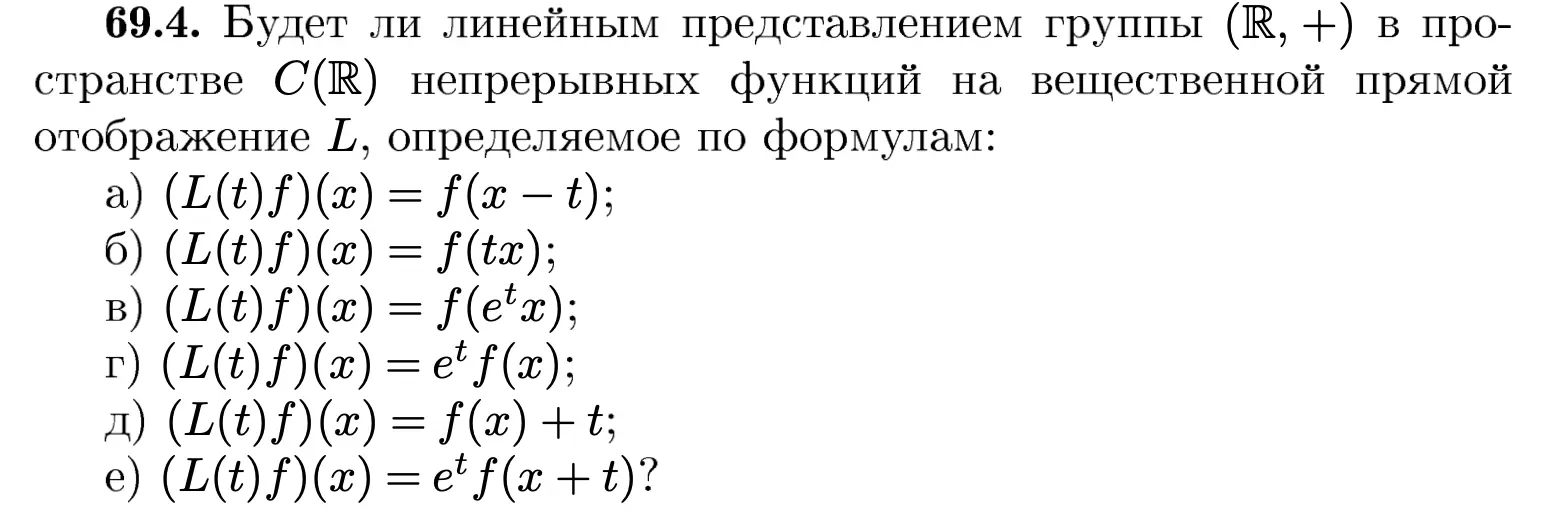 69.4 (Кострикин) Общий принцип решения: Стандартно проверить, является ли L(t) линейным оператором Применить оператор L(t1) к оператору L(t2). Если в результате получится L(t1+t2) - получили линейное представление.