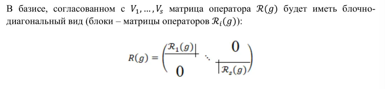 Говорят, что представление разлагается в прямую сумму линейных представлений: если разлагается в прямую сумму инвариантных подпространств: и при этом
