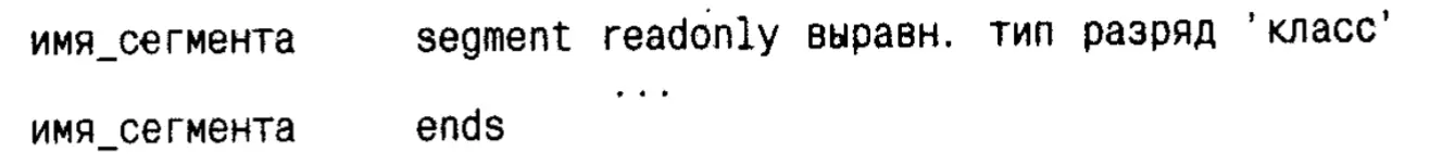 - readonly - если указан, то MASM будет выдана ошибка на все команды, выполняющие запись в этот сегмент
